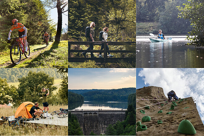 Bildnachweise – Wandern: Sauerland-Tourismus e.V. / Jonas Dülberg / REACT-EU; Zelten: Sauerland-Tourismus e.V. / Paul Masukowitz / REACT-EU; Glörtalsperre: Oben an der Volme (oder) Sauerland-Tourismus / Klaus-Peter Kappest; Kayak: Südwestfalen Agentur GmbH/ Patrick Bonzel; Klettern: Südwestfalen Agentur GmbH/ Patrick Bonzel; Mountainbiken: Sauerland-Tourismus e.V. / Ralf Schanze