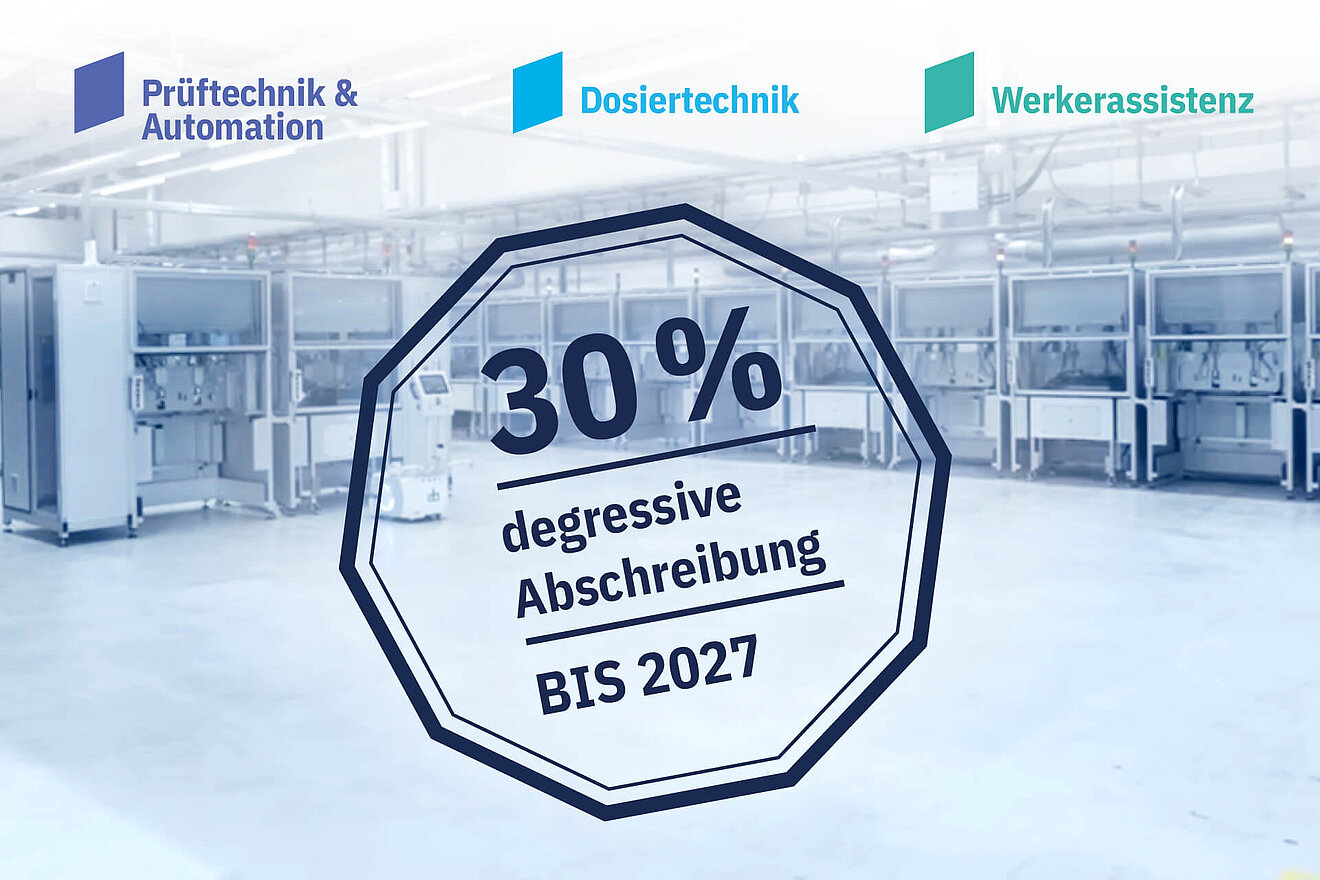 SOMA-Systeme und Lösungen aus den Bereichen Prüftechnik, Dosiertechnik und Werkerassistenz können bis 2027 mit 30% degressiver Abschreibung steuerlich geltend gemacht werden – ein klarer Vorteil für Unternehmen im Maschinenbau, die in Automatisierungstechnik investieren möchten. Das schafft Spielräume, entlastet Budgets und beschleunigt die Umsetzung wichtiger Modernisierungs- und Produktionsautomatisierungsprojekte.