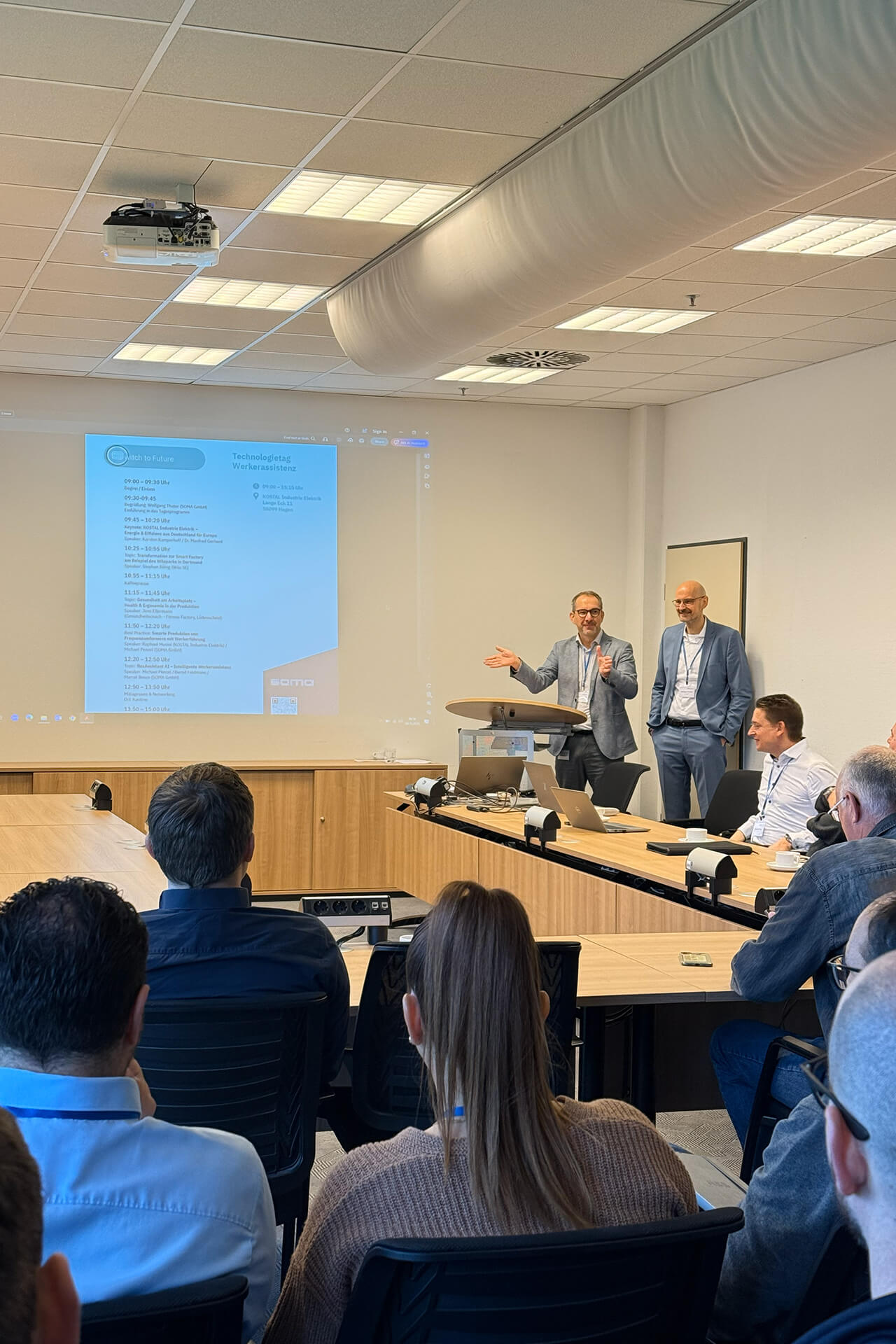 Am 4. Dezember 2025 fand bei der KOSTAL Industrie Elektrik in Hagen der diesjährige SOMA Technologietag rund um die digitale Werkerassistenz flexAssistant statt. Rund 40 Teilnehmende nutzten die Gelegenheit, sich umfassend über den flexAssistant AI und seine neue Generation an Features zu informieren. Der Tag bot einen vielseitigen Mix aus Praxisbeispielen, Fachvorträgen und Live-Demonstrationen und zeigte eindrucksvoll, wie moderne Werkerführung Produktionsprozesse effizienter, ergonomischer und zukunftssicherer macht.